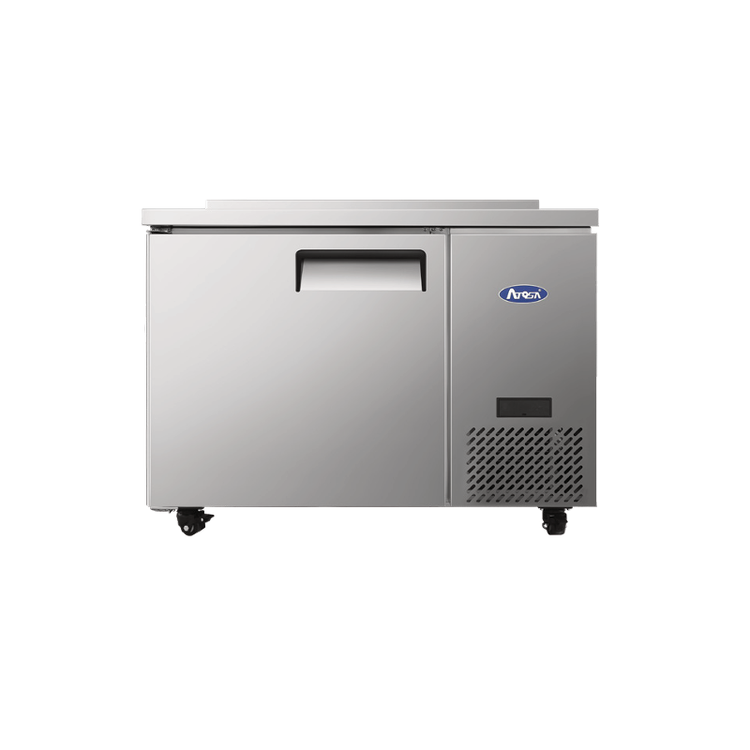 The Atosa USA, Inc. MGF44GR Atosa Worktop Refrigerator is a versatile and efficient cooling solution designed for commercial kitchens. This worktop refrigerator features a 4" backsplash and measures 44 inches in width, 34 inches in depth, and 40-7/10 inches in height, offering ample space for food storage in its one-section setup. The side-mounted, self-contained refrigeration unit ensures convenience and easy access. With a 9.7 cubic feet storage capacity and a hinged solid door, this Atosa Worktop Refrigerator maintains temperatures between 34°F and 40°F, thanks to its electronic temperature control system. The unit includes one adjustable shelf to accommodate various storage needs. For mobility, it comes with 5-inch casters, allowing it to be easily moved within the kitchen environment. Powered by a 1/7 HP motor and operating on 115v/60/1-ph with 2.3 amps, it is equipped with a NEMA 5-15P plug. Safety and sanitation are also priorities, as evidenced by the cETLus and ETL-Sanitation certifications.