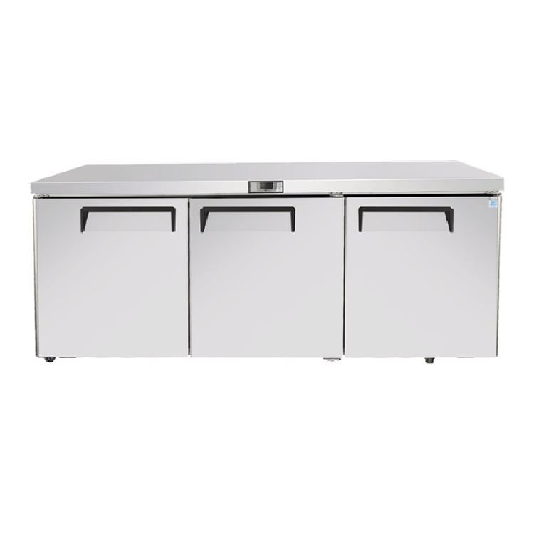 The Atosa USA, Inc. MGF8404GR is a sleek and efficient undercounter refrigerator designed for commercial use. This Atosa undercounter refrigerator features a spacious reach-in design with three sections, measuring 72-11/16 inches in width, 30 inches in depth, and 34-1/4 inches in height. The unit is equipped with a rear-mounted self-contained refrigeration system providing a total storage capacity of 21.13 cubic feet. It includes three hinged solid doors for secure closure and easy access to stored items.