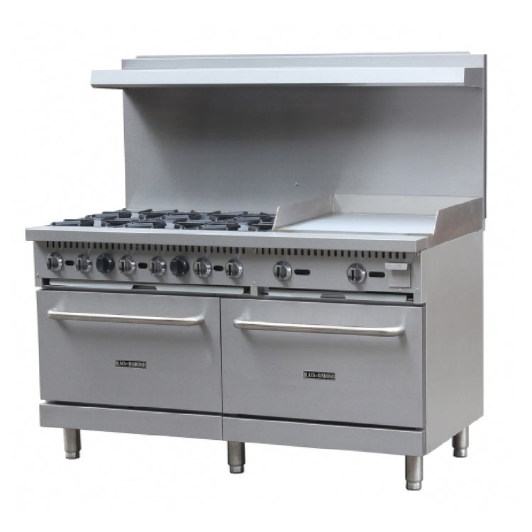 EMPURA, E-GR-6024G/NG, "Range with with 24"" x 21"" Griddle Top, 60""W, 280,000 BTU, Stainless steel front, backriser, and shelf construction, Natural Gas, High rise (24.75"") stainless steel backsplash and shelf, 6 burners (30,000 BTU each), Removable 12"" x 12"" cast iron grates, Individual pilot light for each burner, Individual control knob for each burner, Two standard ovens (30,000 BTU each), 3/4"" Thick Polished Steel Griddle Plate, Griddle Has 3"" High Fully welded Sides and Backsplash, Griddle includes removable crumb and drip tray, Total BTU: 280,000, Spring Loaded doors with cool to touch stainless steel handles, Oven Temperature controlled by thermostat, Oven temperature range: 250 to 550 degrees F, Full width removable drip pan tray, Oven Doors with steel liner insulation, Porcelain Liner on Sides of ovens, 6"" adjustable stainless steel legs, Removable crumb tray for easy cleaning, Includes 2 removable and adjustable oven racks each oven, 3/4"" NPT rear gas connection", ,