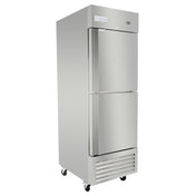 Empura, E-KB27RH, Reach-In Refrigerator, 26-3/4"W x 32-11/16"D x 82-5/16"H, 23 cu. ft. capacity, (2) swing half solid doors, 4" caster, 33°F to 41°F temperature range, HC refrigerant, CFC-free refrigerant and foam, electronic thermostat and digital LED temperature display, self-closing door, magnetic gasket replaceable without tools, concealed heating element, stainless steel exterior, and aluminum painted interior with stainless steel bottom, NEMA-5-15P power cord, 115v/60Hz/1ph, ETL, ETL Sanitation, Tested and conforms to NSF-7 Standards, Empura Refrigeration