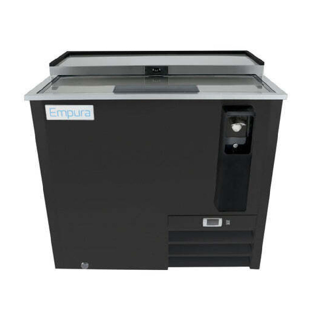 Empura, E-KBC-36, Bottle Cooler, 36.8"W x 27"D x 35"H, (1) solid sliding door, 9.3 cu. ft. capacity, 1" casters, black painted exterior finish, 33F to 41F temperature range, 1/10 HP right side reciprocating compressor, 2,000 BTU (LBP), built in bottle opener with cap catcher, foamed polyurethane insulation throughout the cabinet, R600a refrigerant, 1.8 amps, NEMA-5-15P power cord, 115v/60Hz/1ph, ETL, ETL Sanitation, Tested and conforms to NSF-7 Standards, Empura Refrigeration