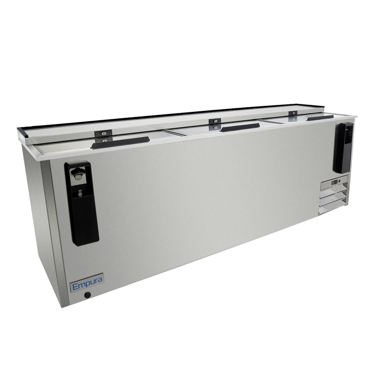 Empura, E-KBC-95-S, Bottle Cooler, 95.3"W x 27"D x 35"H, 29 cu. ft. capacity, (3) solid sliding doors, 3 dividers, 1" casters, stainless steel exterior finish, 33F to 41F temperature range, 1/5 HP right side reciprocating compressor, 7,600 BTU (LBP), built in bottle opener with cap catcher, foamed polyurethane insulation throughout the cabinet, R290 refrigerant, 3 amps, NEMA-5-15P power cord, 115v/60Hz/1ph, ETL, ETL Sanitation, Tested and conforms to NSF-7 Standards, Empura Refrigeration