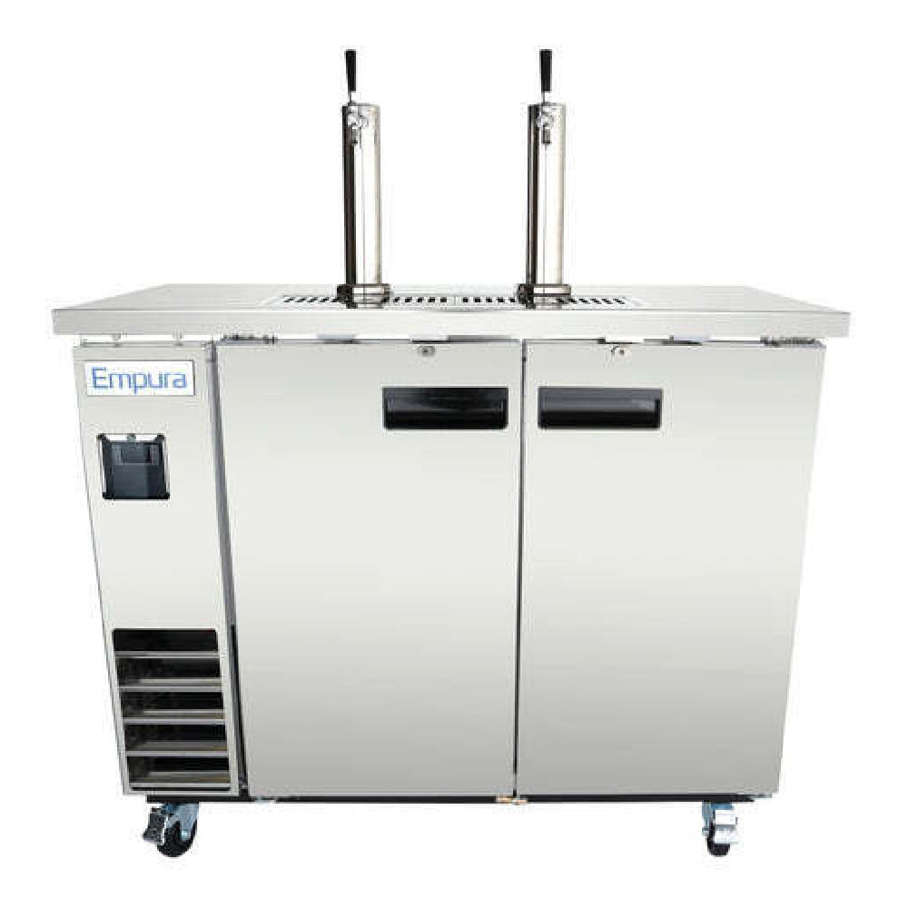 Empura, E-KDD2-2-S, Direct Draw Beer Dispenser, 49.1"W x 24.41"D x 41.9"H, 12.5 cu. ft. capacity, (2) solid swing doors, 2 single tap towers, 2 half keg capacity, 4" casters, stainless steel exterior, 33F to 41F temperature range, 1/5 HP compressor, R290 CFC-free refrigerant, forced air cooling with large fan blades and motor, digital LED temperature control panel and display, electronic thermostat, removable magnetic door gaskets, CFC-free foam insulation, auto electric defrost, 3 amps, NEMA-5-15P power cord, 115v/60Hz/1ph, 3.88 BTU (LBP), ETL, ETL Sanitation, Tested and conforms to NSF-7 Standards, Empura Refrigeration