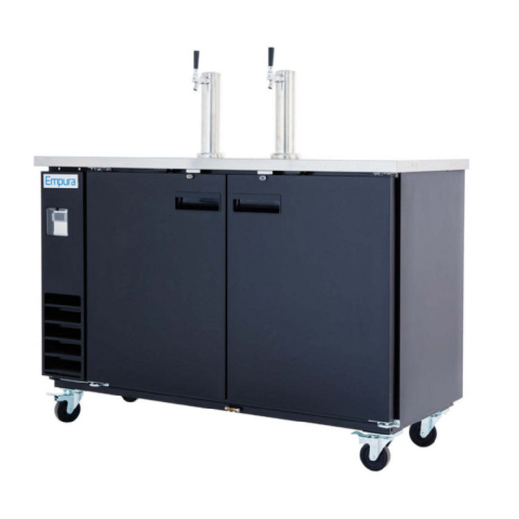 Empura, E-KDD3-2, Direct Draw Beer Dispenser, 61.1"W x 24.41"D x 41.9"H, 16.6 cu. ft. capacity, (2) solid swing doors, 2 single tap towers, 2 half keg capacity, 4" caster, black painted exterior, 33F to 41F temperature range, 3.88 BTU (LBP), R290 CFC-free refrigerant, forced air cooling with large fan blades and motor, digital LED temperature control panel and display, electronic thermostat, removable magnetic door gaskets, CFC-free foam insulation, auto electric defrost, 3 amps, NEMA-5-15P power cord, 1/5 HP 115v/60Hz/1ph, ETL, ETL Sanitation, Tested and conforms to NSF-7 Standards, Empura Refrigeration