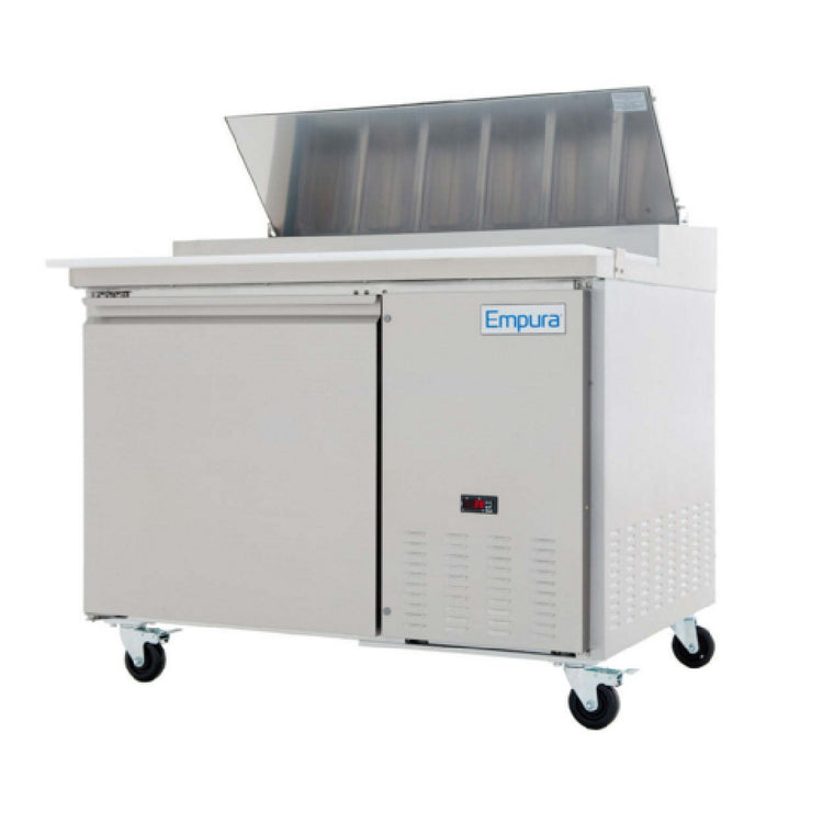 Empura, E-KPP44, Pizza Prep Table, 47.4"W x 32.3"D x 41.3"H, 10 cu. ft. capacity, (1) solid swing door, (1) shelf, 6 pan capacity, stainless steel exterior, 33F to 41F temperature range, 1/3 HP reciprocating compressor, R290 CFC-free refrigerant, removable magnetic door gaskets, electronic thermostat, automatic electric defrost, foam insulation, digital LED temperature display, removable polyethylene cutting board (47.4"W x 17.7"D x 0.55"H), 1,365 BTU (LBP), 5 amps, NEMA-5-15P power cord, 115v/60Hz/1ph, ETL, ETL Sanitation, Tested and conforms to NSF-7 Standards, Empura Refrigeration