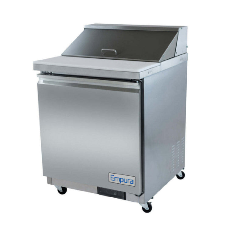 Empura, E-KSP29, Refrigerated Sandwich/Salad Prep Table, 28.9"W x 29.9"D x 43.2"H, 6 cu. ft. capacity, (1) solid swing door, (1) shelf, 8 pan capacity, 2.5" casters, painted stainless steel and aluminum framework, 33F to 41F temperature range, 1/5 HP back reciprocating compressor, foam insulation, removable magnetic door gaskets, electronic thermostat, automatic electric defrost, 853 BTU (LBP), NEMA-5-15P power cord, 3 amps, 115v/60Hz/1ph, ETL, ETL Sanitation, Tested and conforms to NSF-7 Standards, Empura Refrigeration