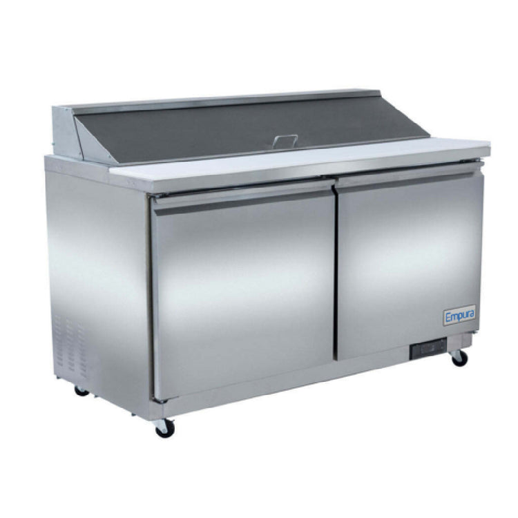 Empura, E-KSP60, Refrigerated Sandwich/Salad Prep Table, 61.2"W x 29.9"D x 43.2"H, 13.2 cu. ft. capacity, (2) solid swing doors, (2) shelves, 16 pan capacity, 2.5" casters, painted stainless steel and aluminum framework, 33F to 41F temperature range, 1/3 HP back reciprocating compressor, 1,365 BTU (LBP), R290 CFC-free refrigerant, foam insulation, removable magnetic door gaskets, electronic thermostat, automatic electric defrost, 115v/60Hz/1ph, 4.3 amps, NEMA-5-15P power cord, ETL, ETL Sanitation, Tested and conforms to NSF-7 Standards, Empura Refrigeration