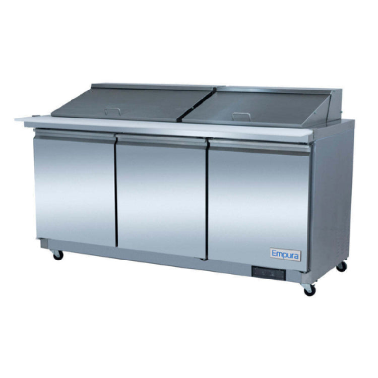 Empura, E-KSP72M, Refrigerated Sandwich/Salad Mega Top Prep Table, 71.7"W x 34.5"D x 43.2"H, 15.6 cu. ft. capacity, (3) swing doors, (3) shelves, 27 pan capacity, 2.5" caster, painted stainless steel and aluminum framework, 33F to 41F temperature range, 1/3 HP back reciprocating compressor, 1,365 BTU (LBP), R290 CFC-free refrigerant, foam insulation, electronic thermostat, digital LED temperature display, removable magnetic door gasket, electronic thermostat, 4.3 amps, NEMA-5-15P power cord, 115v/60Hz/1ph, ETL, ETL Sanitation, Tested and conforms to NSF-7 Standards, Empura Refrigeration