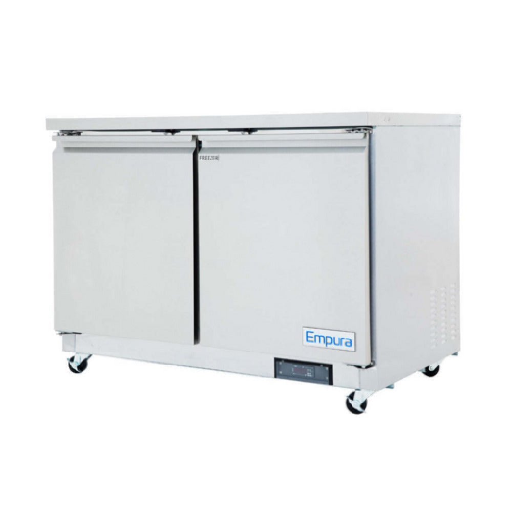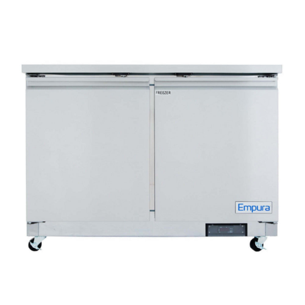 Empura, E-KUC48F, Undercounter Reach-In Freezer, 48.2"W x 29.9"D x 35.5"H, 10.1 cu. ft. capacity, (2) swing door solid doors, (2) shelves, -10F to 0 F temperature range, 1/3 HP back reciprocating compressor, 1,160 BTU (LBP), foam insulation, magnetic gasket, electronic thermostat, automatic defrost, digital temperature control, 4 amps, NEMA-5-15P power cord, 115v/60Hz/1ph, ETL, ETL Sanitation, Tested and conforms to NSF-7 Standards, Empura Refrigeration