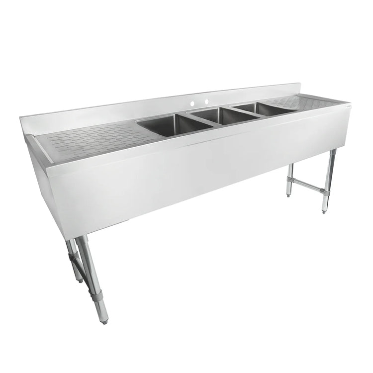 Empura, EB3B101410LR19, Underbar Sink, (3) bowls (10" X 14" X 10"), 3 Compartment, 19" left and 19" right drainboards, 3.5" ips drainage 18 gauge 304 stainless steel, top, NSF, Empura Stainless
