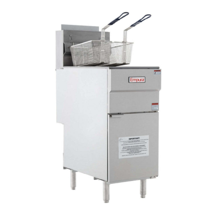 Empura, EGF-45/55_NAT, Gas Fryer, 15.5"W x 30.125"D x 47"H, natural gas, 15 1/2" Commercial Gas Fryer with 50lb capacity, 120,000 BTU, Floor standing, Stainless steel Front, Galvanized steel sides, Thermostatically controlled - Prompt Response for fast temp recovery, 200 - 400 Degrees Fahrenheit, Open Stainless steel Fry Pot with Cold Zone, 4 Cast Iron Vertical Burner Tubes, Includes 2 baskets, Stainless steel hanger plate included, Built-in Stainless Steel heat exchanger with baffle, Automatic shut off, Stainless steel front & door with galvanized sides & back, 6"" Stainless Steel Adjustable Legs, 120,000 BTU total, 450 degrees F High Limit for Safety, 1-1/4"" Full Port Drain Valve, ETL, ETL Sanitation, cETLus, Tested and conforms to NSF/ANSI Std. 4, Empura Equipment
