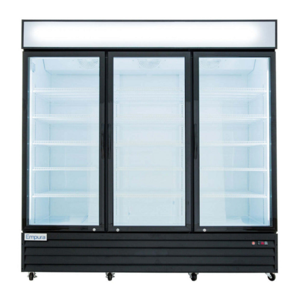 Empura, EGM-75B, Refrigerated Merchandiser, 78.15"W x 32.28"D x 81.02"H, 66.6 cu. ft. capacity, (3) glass swing doors, (15) shelves, black powder-coated steel exterior and white aluminum interior, 32-50 F temperature range, 1/2 HP back compressor, R290 CFC-free refrigerant, 2,273 BTU/h, electronic thermostat, digital LED temperature display, foamed-in-place high-density CFC-free polyurethane insulation, 6.8 amps, US plug type, 110v/60Hz/1ph, ETL, ETL Sanitation, cETLus, Tested and conforms to NSF-7 Standards, Empura Refrigeration