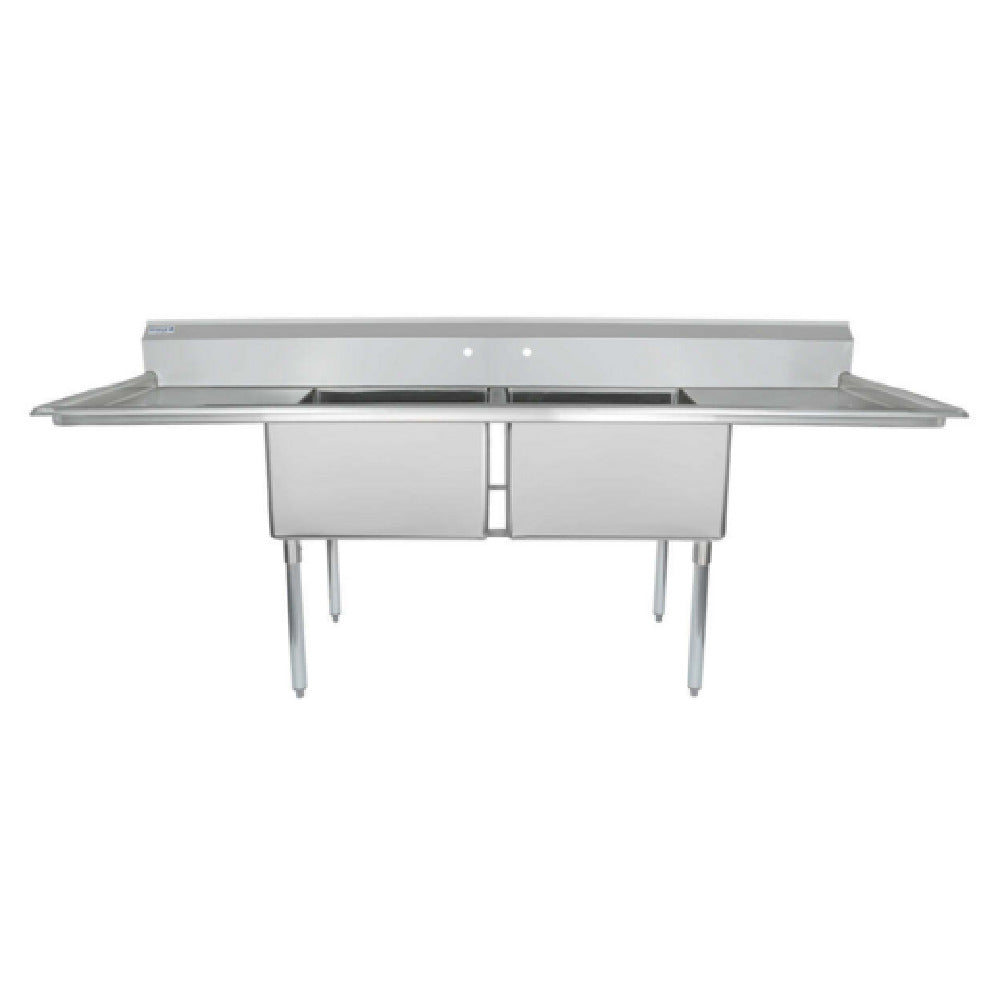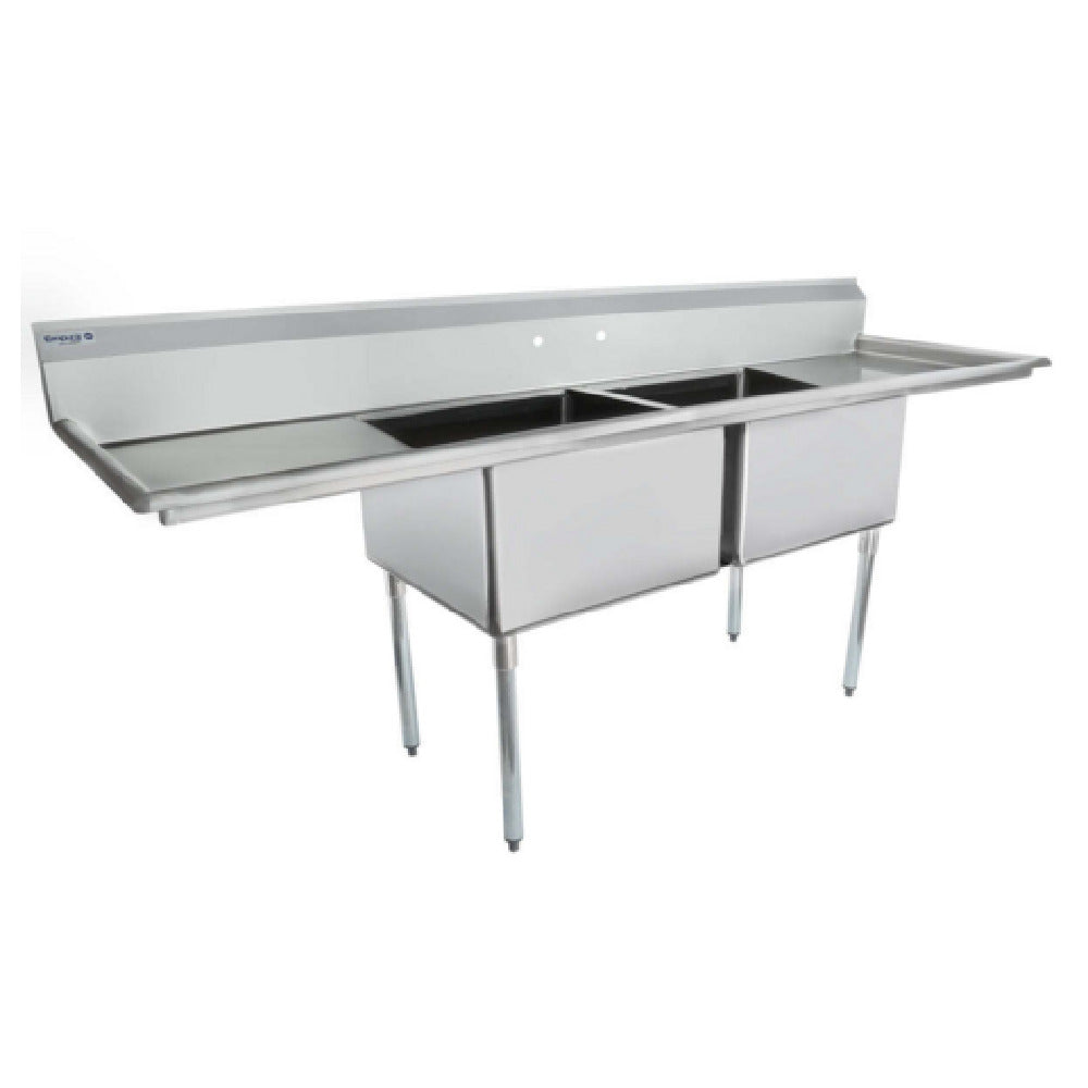 Empura, ESD22424LR24, Sink, 98"W x 29.5"D x 44.25"H, (2) compartment, standard duty, 18 gauge 304 stainless steel, 4" galvanized legs, plastic adjustable feet, (2) 24" drainboards, (2) bowls 24"L x 24"W x 14"D, 9.75" back splash, NSF, Empura Stainless