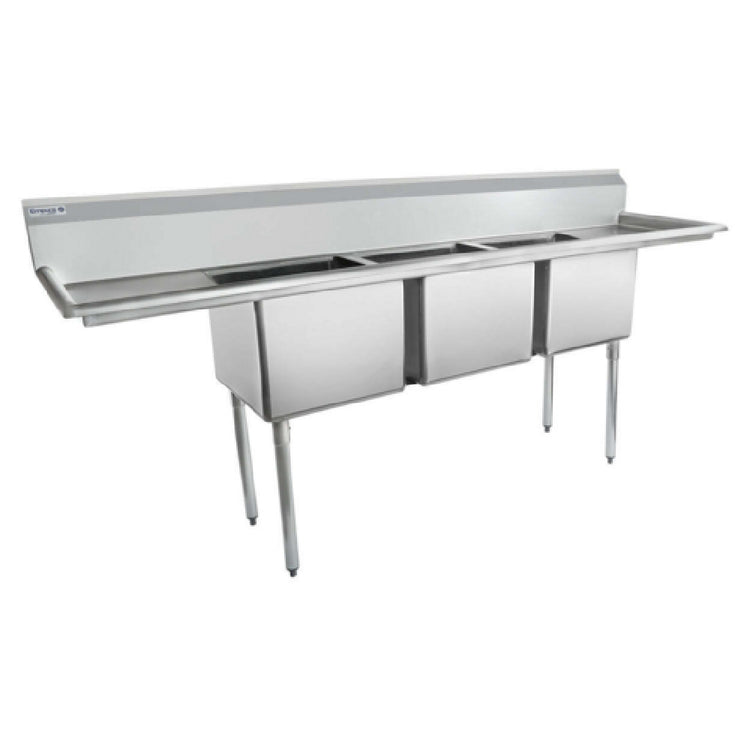 Empura, ESD31818LR18, Sink, 94"W x 23.5"D x 44.25"H, (3) compartment, standard duty, 18 gauge 304 stainless steel, 4" galvanized legs, plastic adjustable feet, (2) 18" drainboards, (3) bowls 18"L x 18"W x 14"D, 9.75" back splash, NSF, Empura Stainless
