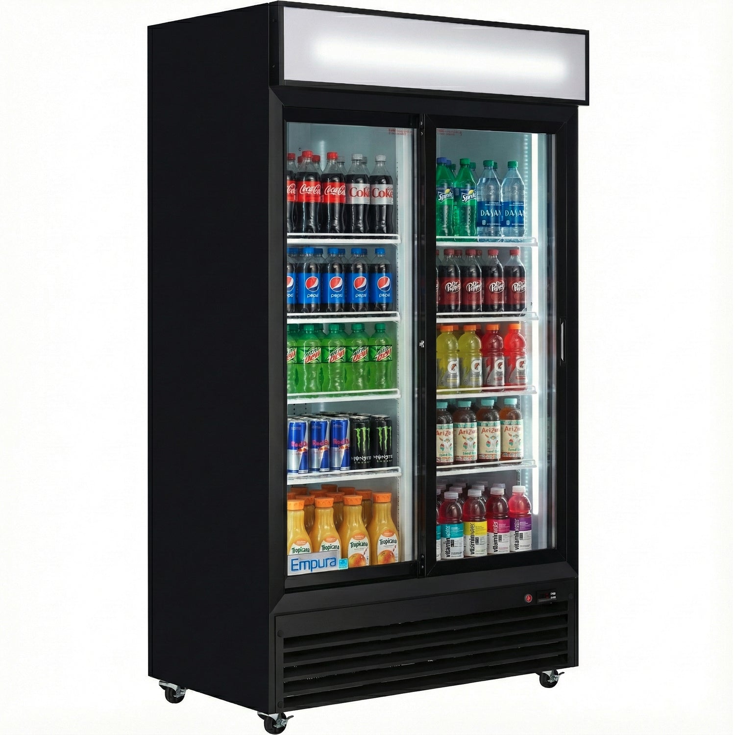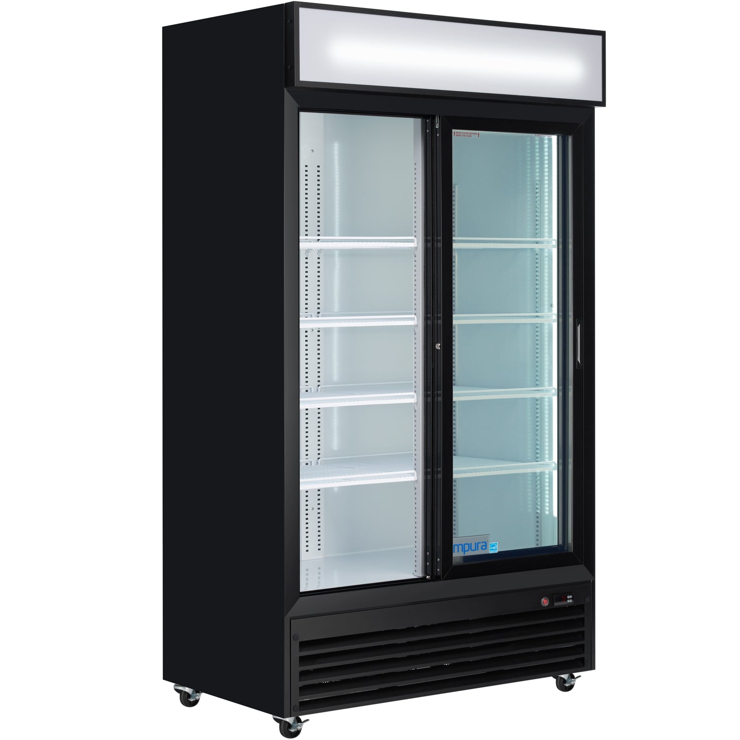 Empura, ESM-36B, Refrigerated Merchandiser, 44.49"W x 27.56"D x 79.65"H, 35 cu. ft. capacity, (2) glass sliding doors, (8) shelves, baked enamel steel black exterior and white interior, 32-50 F temperature range, 1/7 HP back compressor, US plug type, 1,276 btu/h, R290 CFC-free refrigerant, electronic thermostat, digital LED temperature display, foamed-in place high density CFC-free polyurethane insulation, 3.3 amps, 110v/60Hz/1ph, ETL, ETL Sanitation, cETLus, Tested and conforms to NSF-7 Standards, Empura Refrigeration