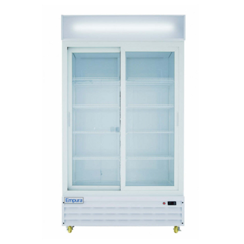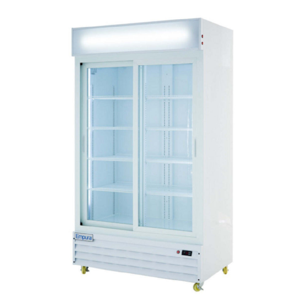 Empura, ESM-36W, Refrigerated Merchandiser, 44.49"W x 27.56"D x 79.65"H, 35 cu. ft. capacity, (2) glass sliding doors, (8) shelves, baked enamel steel white exterior and interior, 32-50 F temperature range, 1/7 HP back compressor, 1,276 btu/h, R290 CFC-free refrigerant, electronic thermostat, digital LED temperature display, foamed-in place high density CFC-free polyurethane insulation, 3.3 amps, US plug type, 110v/60Hz/1ph, ETL, ETL Sanitation, cETLus, Tested and conforms to NSF-7 Standards, Empura Refrigeration