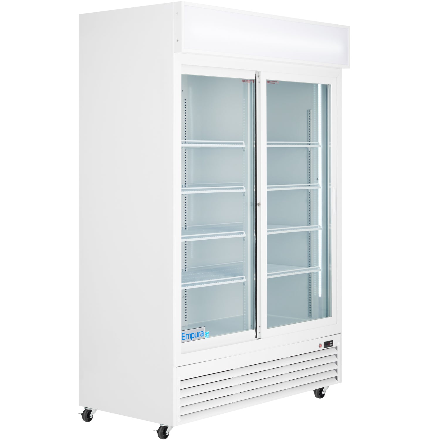 Empura, ESM-42W, Refrigerated Merchandiser, 52.36"W x 27.56"D x 79.65"H, 42 cu. ft. capacity, (2) glass sliding doors, (8) shelves, baked enamel steel white exterior and interior, 32-50 F temperature range, 1/7 HP back compressor, R290 CFC-free refrigerant, 1,276 BTU/h, electronic thermostat, digital LED temperature display, foamed-in place high-density CFC-free polyurethane insulation, 3.3 amps, US plug type, 110v/60Hz/1ph, ETL, ETL Sanitation, cETLus, Tested and conforms to NSF-7 Standards, Empura Refrigeration