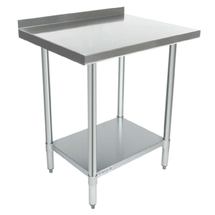 Empura, EWT2B2430, Work Table, 30"W x 24"D x 35"H, economy duty, 2 inch backsplash, plastic adjustable bullet feet, galvanized steel 1-5/8" diameter leg, galvanized steel hat channel, 18 gauge under shelf, galvanized steel under shelf, 18 gauge top shelf, 430 stainless steel top shelf, NSF, Empura Stainless