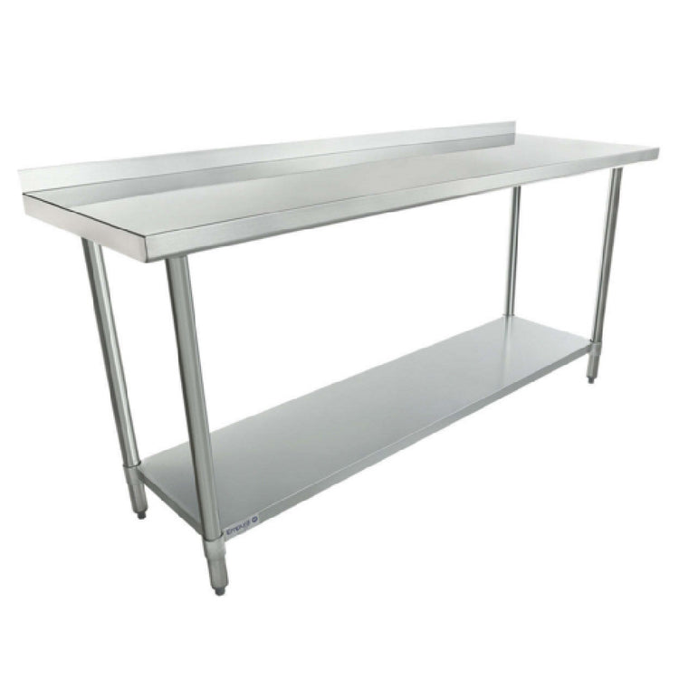 Empura, EWT2B2472, Work Table, 72"W x 24"D x 35"H, economy duty, 2 inch backsplash, plastic adjustable bullet feet, galvanized steel 1-5/8" diameter leg, galvanized steel hat channel, 18 gauge under shelf, galvanized steel under shelf, 18 gauge top shelf, 430 stainless steel top shelf, NSF, Empura Stainless