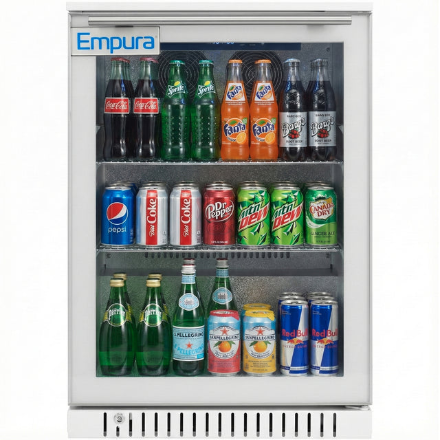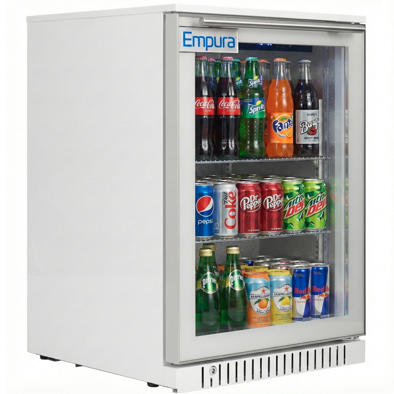 Empura, LG-E150-W, Refrigerator, Merchandiser, Undercounter, 23.62"W x 25.39"D x 33.86"H, 5.5 Cubic FT, white baked enamel steel finish exterior, embossed aluminum interior, LED interior lighting, 1 double-pane locking self-closing glass door, 3 heavy-duty polyethylene chrome shelves, electronic thermostat, Digital LED temperature display, CFC free refrigerant: R600a, 26 to 50 degrees F, Foamed-in place high density CFC-free polyurethane insulation, cooling system designed and suitable for outdoor use, 115 Volts, 60 Hz, 1-phase and 1.5 Amps for 1/10 HP, NEMA-5-15P plug, ETL, ETL Sanitation, cETLus, Tested and conforms to NSF-7 Standards, Empura Refrigeration
