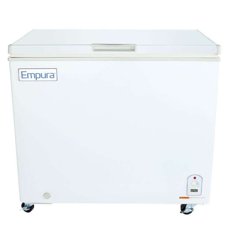 Empura, E-CF-7, Solid Lid Chest Freezer, 37.52"W x 23.15"D x 31.93"H, 7.1 cu. ft. capacity, -10F to 0 F temperature range, 115v-60hz-1ph, NEMA 5-15P power cord, temperature display, front drainage for easy water collection, stealthy handling, strong and durable for kitchen use, internal round edges for easy cleaning, balanceable door hinges that stop at 35 to 70 angles, quick and deep freezing, low noise design, equipped with a lock, ETL, ETL Sanitation, Tested and conforms to NSF-7 Standards, Empura Refrigeration