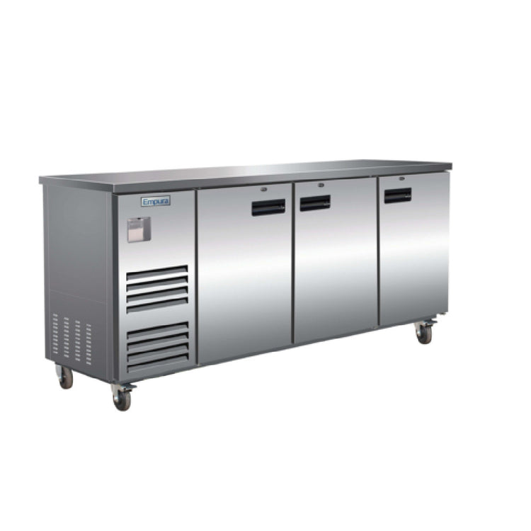 Empura, E-KBB90-3-27-S, Back Bar Cooler, 3 swing solid doors, 90"W x 27 5/8"D x 42 1/2"H, 33-41 F temperature, 115v/60hz/1ph, NEMA-5-15P power cord, HC refrigerant, CFC free refrigerant and foam, Electronic thermostat and digital LED temperature display for accurate control and easy reading, Self-closing door, Magnetic gasket can be replaced without any tools, Stainless steel top, Stainless steel interior and exterior, ETL, ETL Sanitation, Tested and conforms to NSF-7 Standards, Empura Refrigeration