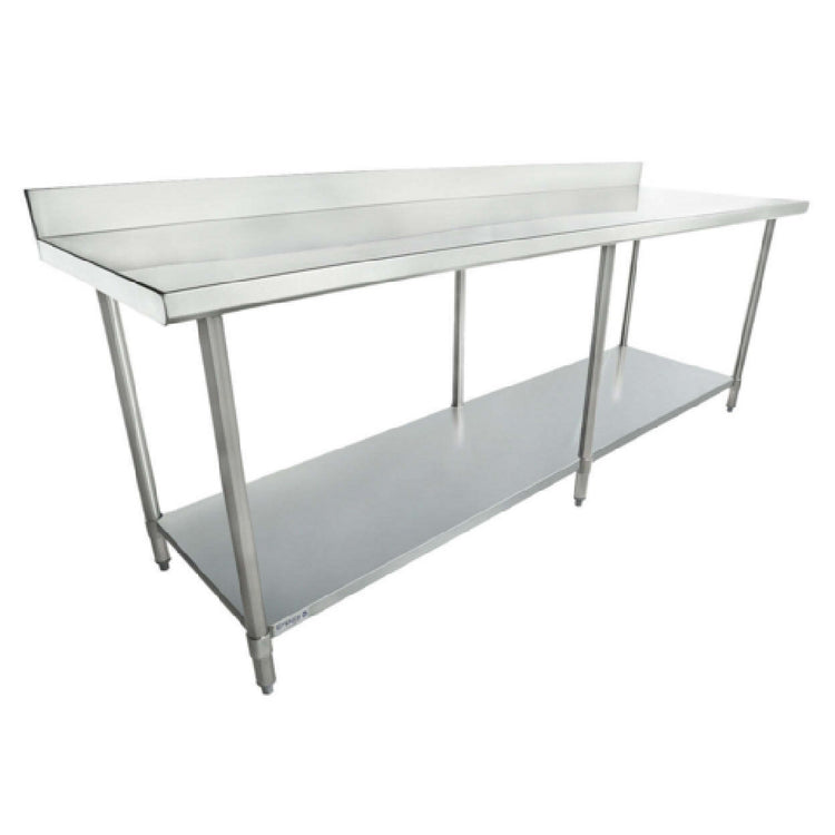 Empura, WT4B3096, Work Table, 96"W x 30"D x 35"H, standard duty, 4 inch backsplash, plastic adjustable bullet feet, galvanized steel 1-5/8" diameter leg, galvanized steel hat channel, 18 gauge under shelf, galvanized steel under shelf, 18 gauge top shelf, 304 stainless steel, top shelf, NSF, Empura Stainless