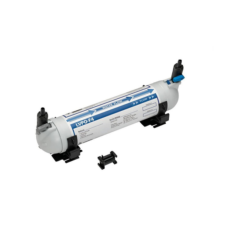 Features: The LVPO-F4 system incorporates a single LVPO-F4 Fibredyne® carbon block cartridge, capable of filtering up to 250 gallons of water. The system is constructed for durability and easy integration into existing plumbing systems.