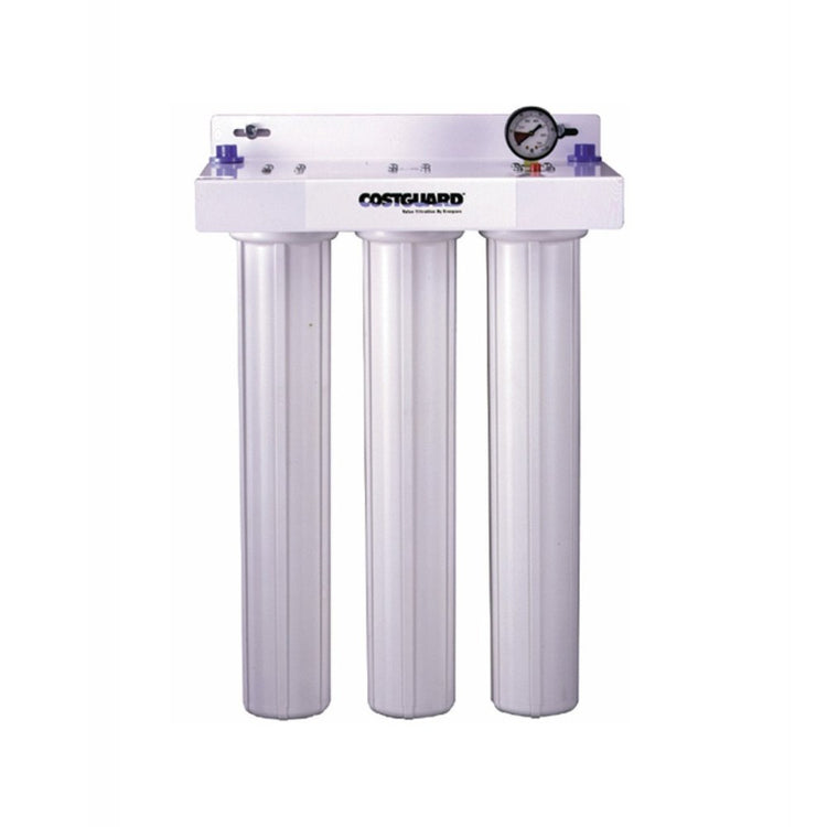 Features: The EV910050 features three CGS-55 20" low profile water filter housings, a mounting bracket for secure installation, a water pressure gauge for monitoring system performance, and a pressure relief button for safe operation. The system is designed for durability and easy integration into existing plumbing systems.