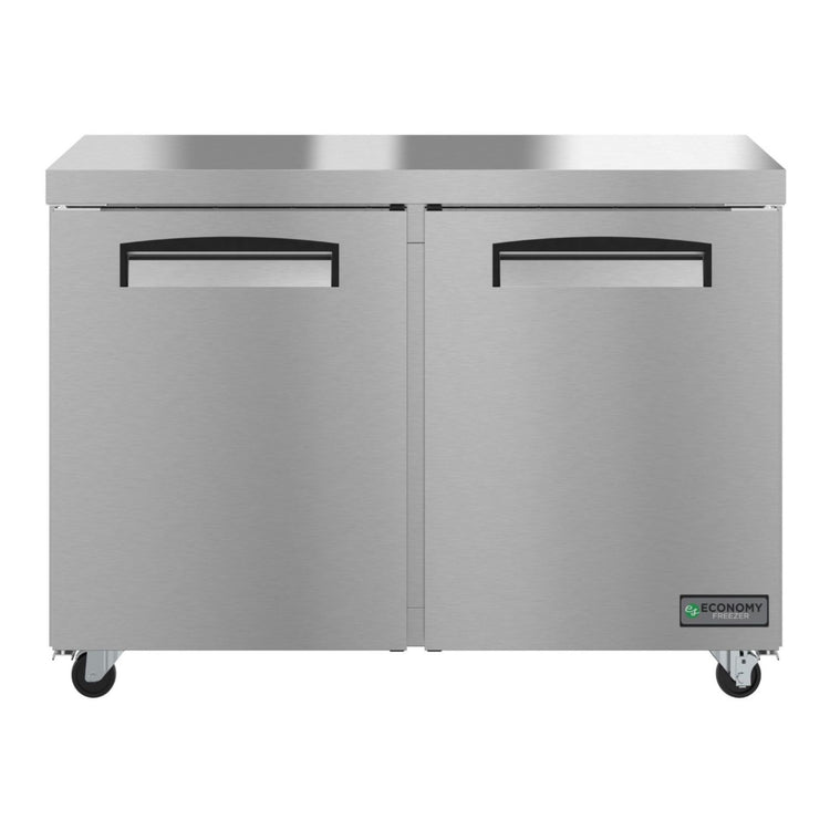 Features: The EUR48A boasts a robust design with a stainless steel exterior front, sides, and top, combined with a stainless steel interior floor and aluminum front, sides, and top. Its self-contained, rear-mounted refrigeration system ensures efficient cooling, while the two solid hinged doors and two adjustable shelves offer convenient access and organization.
