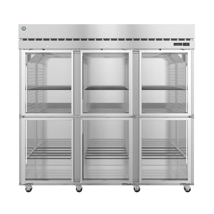 The Hoshizaki R3A-HG Steelheart Series Refrigerator is a three-section reach-in unit offering a generous 79.03 cubic feet of storage. This self-contained refrigeration system utilizes a solid-state digital controller with temperature alarms and an LED display for precise temperature management. Its durable stainless steel interior and exterior (front and sides) provide lasting quality. This standard-depth Steelheart Series refrigerator features six half-height hinged glass doors for easy access to contents and nine adjustable shelves for customized storage. Mobility is ensured with eight 4-inch heavy-duty casters, three of which include brakes. The R3A-HG employs environmentally friendly R290 Hydrocarbon refrigerant and operates on two 1/4 HP motors, using a NEMA 5-15P plug. This series refrigerator is cETLus and ETL-Sanitation certified, and boasts an ENERGY STAR® rating for energy efficiency.