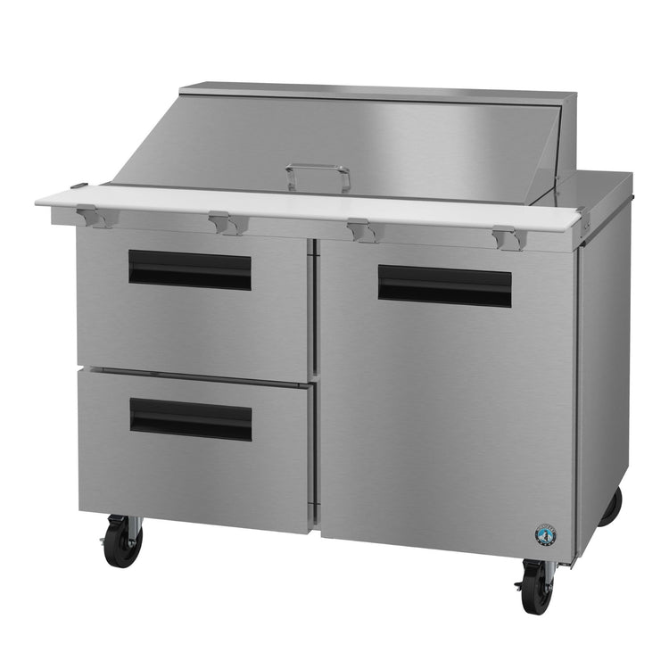 Hoshizaki, SR48B-18MD2, Steelheart Series Mega Top Refrigerator, reach-in, two-section, 48"W, 13.66 cu. ft., self-contained rear mounted refrigeration system, (1) door, (1) adjustable shelf, (2) drawers, provided with (18) 1/6 top pans 4" deep, 6" maximum pan depth (drawer & top rail), 10" D x 1/2" thick white polyethylene cutting board & a full set of adapter bars, stainless steel interior, stainless steel exterior front, sides & hinged top cover, (4) 6" casters (2 with brakes), hot gas condensate removal, R290 hydrocarbon refrigerant, 1/5 HP, cord, NEMA 5-15P, cETLus, ETL-Sanitation (Made to order: allow 4-6 week lead time)