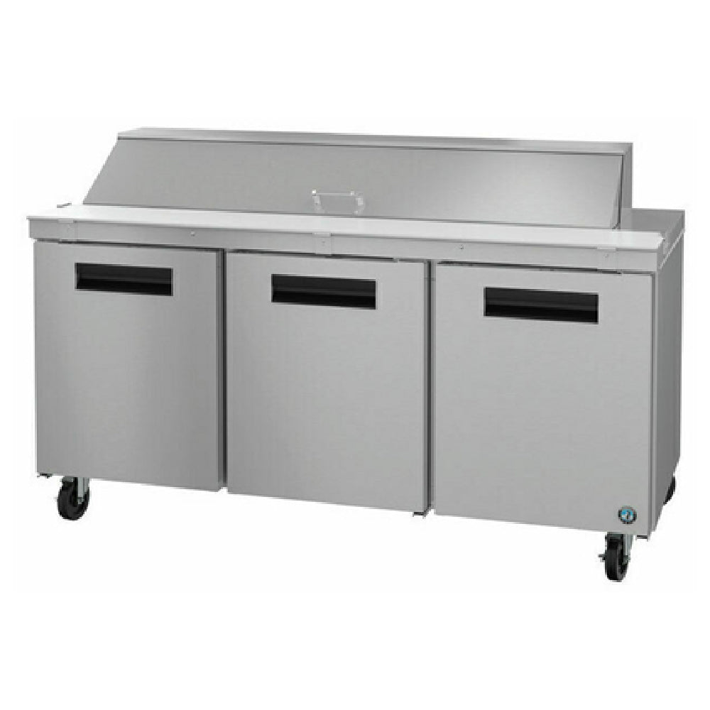 Hoshizaki, SR72B-18, Steelheart Series Sandwich Top Refrigerator, reach-in, three-section, 72"W, 18 cu. ft., self-contained rear mounted refrigeration system, (3) solid hinged doors, (2) adjustable shelves, provided with (18) 1/6 pans 4" deep, 6" maximum pan depth (top rail), 10" D x 1/2" thick white polyethylene cutting board & a full set of adapter bars, stainless steel interior, stainless steel exterior front, sides & hinged top cover, (4) 6" casters (2 with brakes), hot gas condensate removal, R290 Hydrocarbon refrigerant, 1/3 HP, 115v/60/1-ph, 6.3 amps, cord, NEMA 5-15P, ETL-Sanitation, cETLus