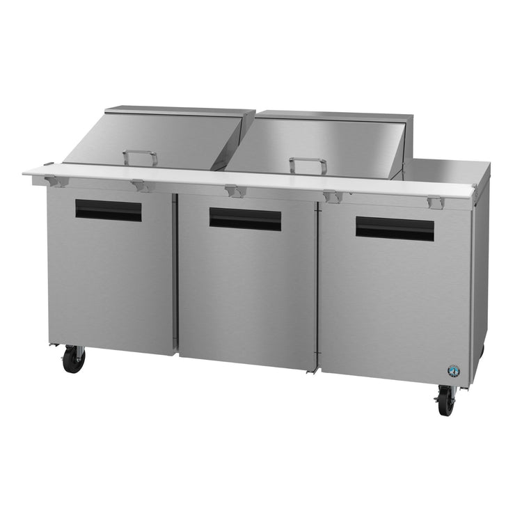 Features: This refrigerator features a 72-inch width, three solid hinged doors, and three adjustable shelves. The unit is equipped with twenty-four 1/6 size pans, 4 inches deep, with a maximum pan depth of 6 inches (to the top rail). A 10-inch deep by 1/2-inch thick white polyethylene cutting board and a full set of adapter bars are included. The exterior front, sides, and hinged top cover are constructed of stainless steel, as is the interior. Mobility is facilitated by four 6-inch casters, two of which have brakes. The unit utilizes a 1/3 HP motor and connects to a standard NEMA 5-15P electrical outlet. It is cETLus and ETL-Sanitation certified.
