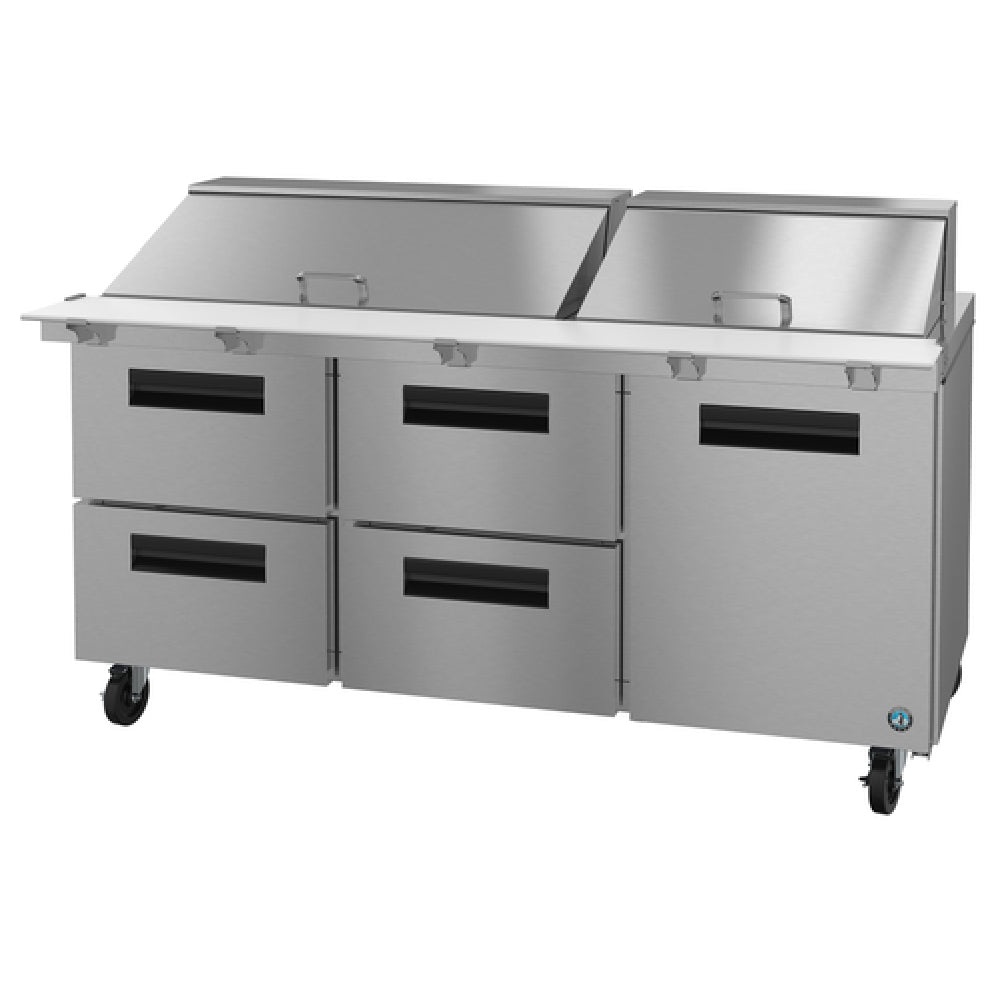 Hoshizaki, SR72B-30MD4, Steelheart Series Mega Top Refrigerator, three-section, 72"W, 18 cu. ft., self-contained rear mounted refrigeration system, (1) solid hinged door, (1) adjustable shelf, (4) drawers, provided with (30) 1/6 pans 4" deep, 6" maximum pan depth (drawer & top rail), 10" D x 1/2" thick white polyethylene cutting board & a full set of adapter bars, stainless steel interior, stainless steel exterior front, sides & hinged top cover, hot gas condensate removal, (4) 6" casters (2 with brakes), R290 Hydrocarbon refrigerant, 1/3 HP, NEMA 5-15P, cETLus, ETL-Sanitation (Made to order: allow 4-6 week lead time)