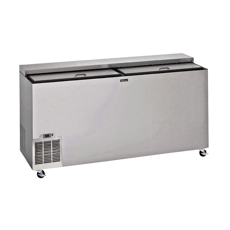 Features: The FR48RT-SS-STK features a spacious 12.5 cubic foot interior, accessible via two dent-resistant stainless steel sliding doors with die-cast handles. A door frame heater prevents condensation buildup, while the manual defrost and self-evaporating condensing pan simplify maintenance. Internal floor racks organize glassware effectively.