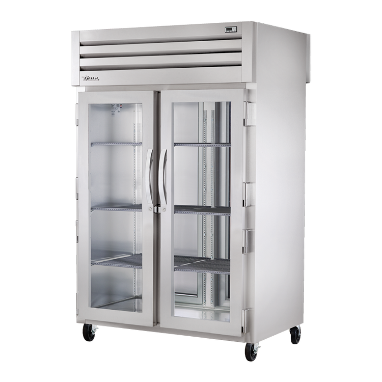 Features: Pass-Thru Design, Digital Temperature Control, Stainless Steel Construction The STR2HPT-2G-2S features a convenient pass-thru configuration with two glass doors on the front and two stainless steel doors on the rear, all equipped with locks. Cam-lift hinges ensure smooth door operation. Precise temperature control is managed via a digital thermostat. Two interior kits are included, along with 5" castors for mobility.